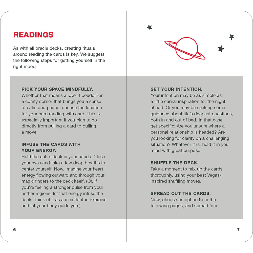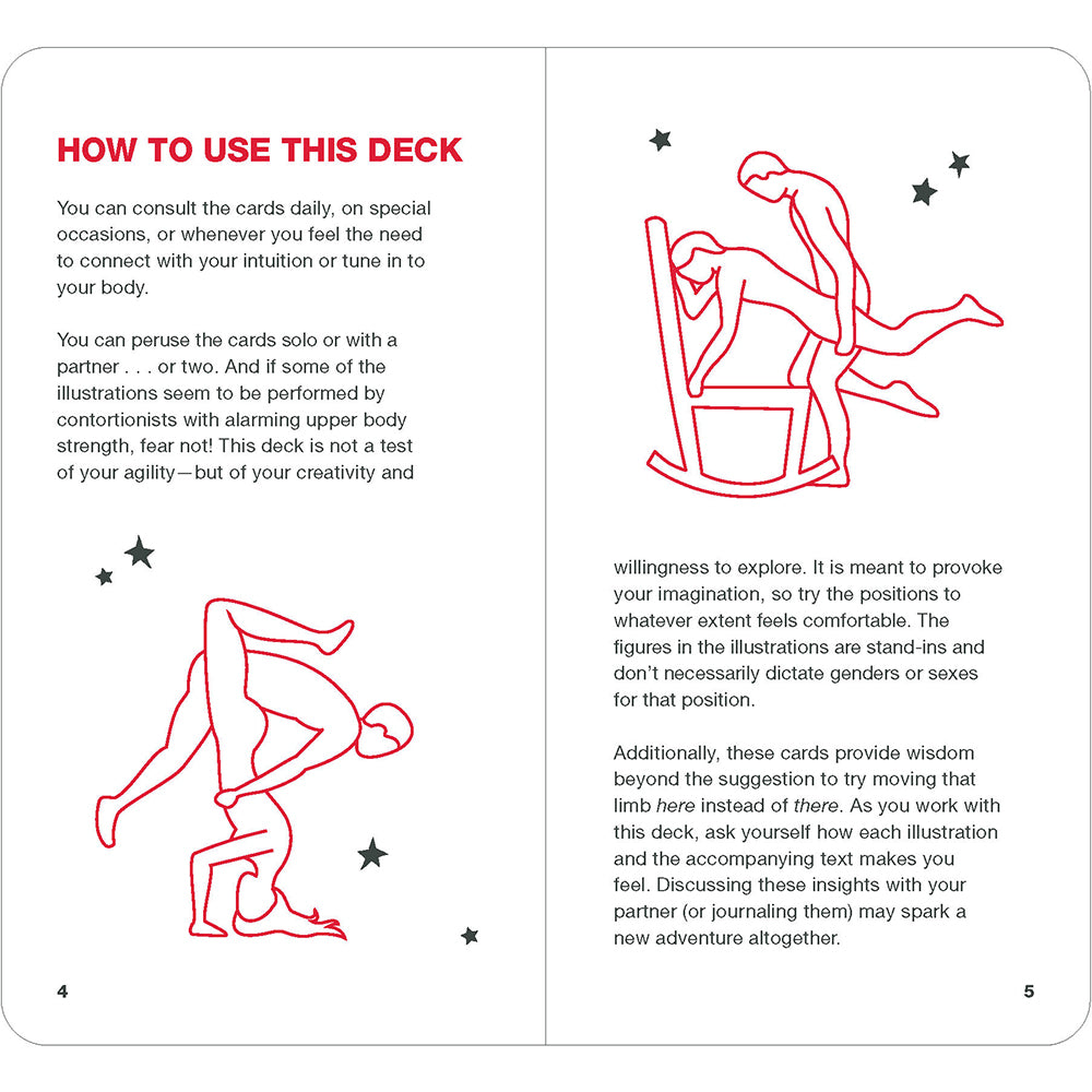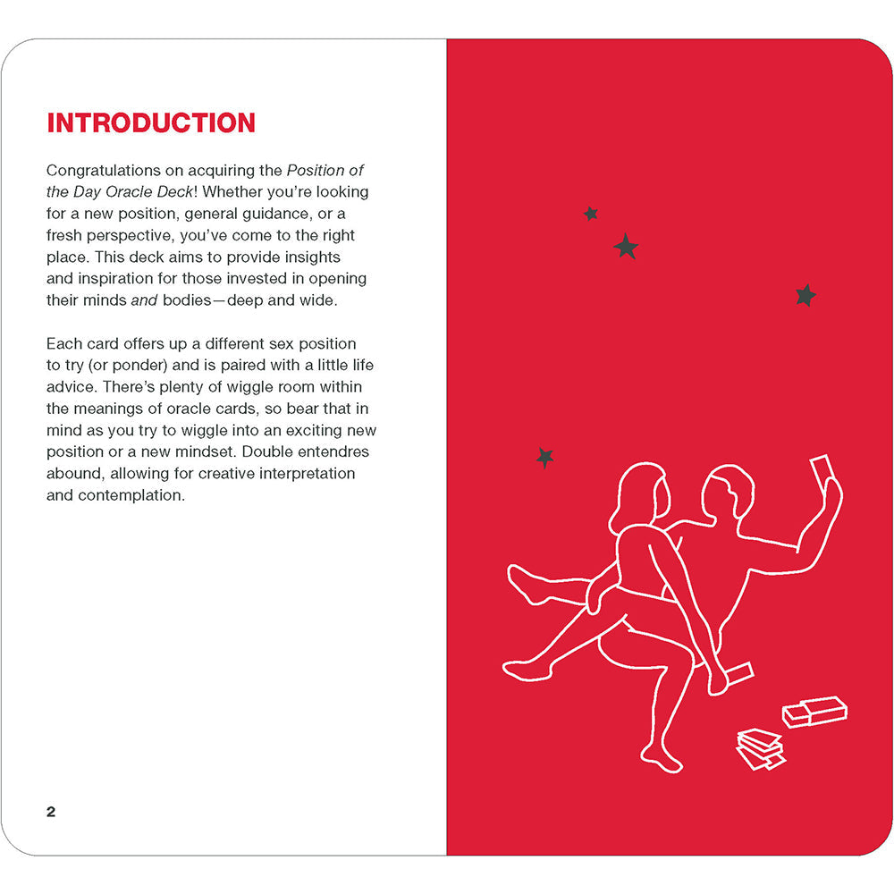 Position of the Day Oracle Deck78 Sex Positions to Inspire Bold MovesBy Visible MediaCards + Paperback; 78 pagesFrom the bestselling Position of the Day series, this playful and provocative oracle deck is the perfect tool for anyone seeking insights on life, love, and sex.Get creative and have fun with 78 mind- (and body-) bending positions! Each card features an illustrated sex position to try (or ponder), along with life advice that is sure to enlighten and amuse. With an accompanying guidebook that provides instructions on how to pull cards and lay out different spreads, this deck encourages you to open your mind and body and explore new positions and perspectives. Pull a card solo or with your partner(s) and get ready to connect with your deepest desires!TRUSTED RESOURCE: With over 1.7 million copies sold in the book series (Position of the Day and Position of the Day Playbook), Position of the Day is the go-to resource for all things fun and sexy.SEXY MEETS MYSTICAL: Swap out your traditional oracle deck for this fresh and fun set! Includes positions of varying degrees of difficulty for creative interpretation and contemplation. (Note: This deck is not a test of your agility; it is meant to provoke your imagination, so try the positions to whatever extent feels comfortable.) There''s plenty of wiggle room within the meanings of oracle cards, so keep that in mind as you try to wiggle into an exciting new position or new mindset.ADULT FUN FOR DAILY USE & SPECIAL OCCASIONS: Consult the cards whenever you want to connect with your intuition or tune into your (or your partner''s) body. Pull a card for yourself or do a reading for two. These sex position cards will keep date night fun and interesting! Makes a great gift or self-purchase for Valentine''s Day, anniversaries, bachelor/bachelorette parties, or anytime gift to spice things up.INCLUSIVE IMAGES: Perfect for folks of all sexual orientations and gender identities looking for a sexy, playfuland tastefuloracle deck. (Note: The figures in the illustrations are stand-ins and don''t necessarily dictate genders or sexes for that specific position.)Perfect for: Fans of Position of the Day books Couples of all orientations Tarot and oracle deck users looking for something fun and distinctive Mystics with a sense of humor Novelty deck collectors Anyone who enjoys sex and sexy games Sex-positive gift-giving for birthday, anniversary, Valentine''s Day, or just for fun